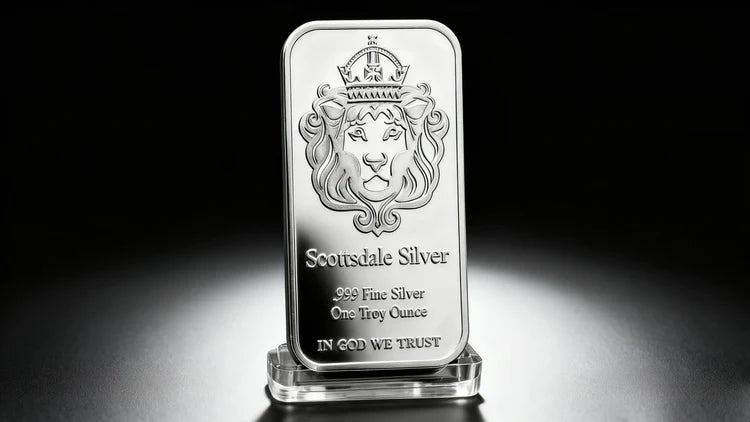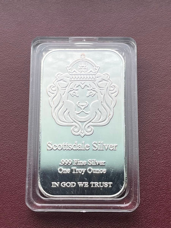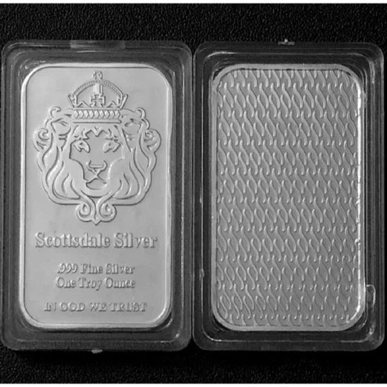 The bar's front features the iconic Scottsdale crowned lion—a symbol of strength and trust—at its center. Surrounding the lion: inscriptions like"Scottsdale Silver",".999 Fine Silver","One Troy Ounce", and"In God We Trust". Every detail honors the mint's commitment to legacy and American heritage.